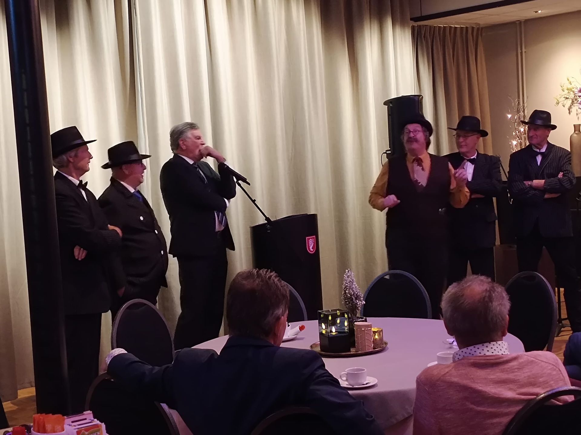 Tijdens de nieuwjaarsrede van onze voorzitter Loek werd hij plotseling onderbroken door de heer Goudsappel en het jubileumcomité. Aanvankelijk herkende niemand de heer Goudsappel, maar dat bleek geheel verklaarbaar: in 1936 had hij een sigarenmagazijn in Naaldwijk. En laat dat nu precies het jaar zijn waarin onze sociëteit werd opgericht — inmiddels 90 jaar geleden! Een schitterende aankondiging van de feestelijkheden die ons in het komende jubileumjaar te wachten staan.